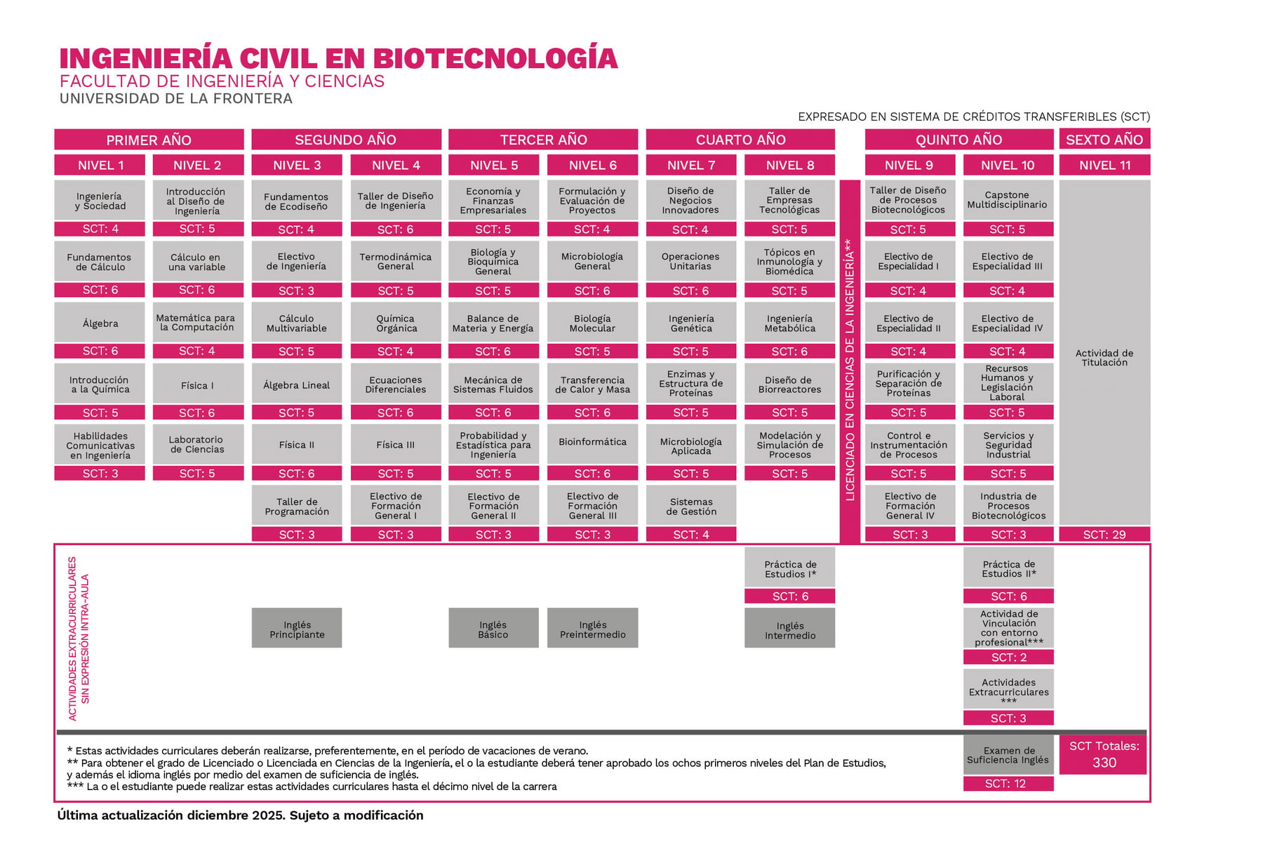 El Ingeniero o la Ingeniera Civil en Biotecnología de la Universidad de La Frontera es un profesional con capacidades para desempeñarse en áreas de procesos productivos, biotecnología industrial, y en la gestión y proyectos de sistemas productivos que utilizan sistemas biológicos, materia orgánica, organismos vivos y sus derivados, contribuyendo al desarrollo económico y social del país y la región.